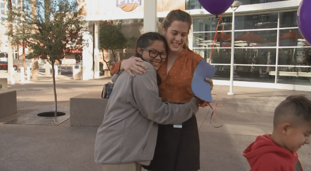Instead, her 12-year-old mentee Angelica surprised her by waiting in the plaza outside of Talking Stick Arena with balloons, a banner, thank you note and hug.